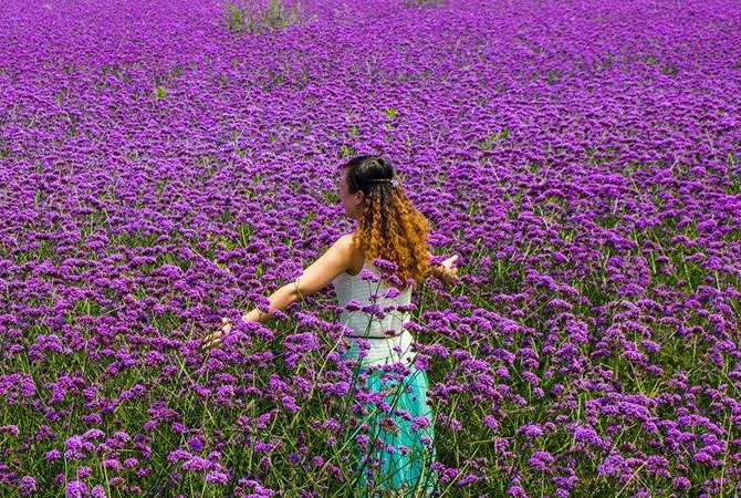 馬鞭花景區(qū),近百畝馬鞭草花田里,鮮花盛開。遠遠望去,如同為綠色大地鋪上一層紫色的地毯。微風拂動下,紫色的馬鞭草愈發(fā)動人,吸引了不少游客前來拍照留影。